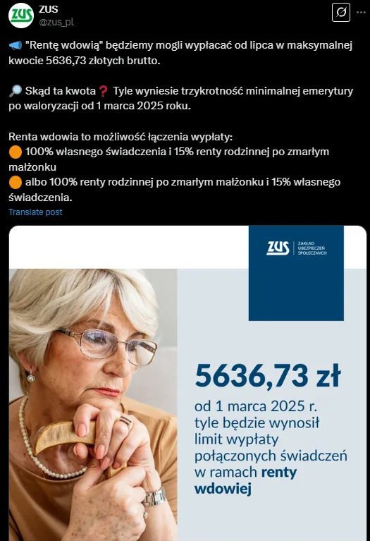 ZUS zakomunikował, że od lipca 2025 roku maksymalna kwota renty wdowiej wyniesie 5636,73 złotych brutto.